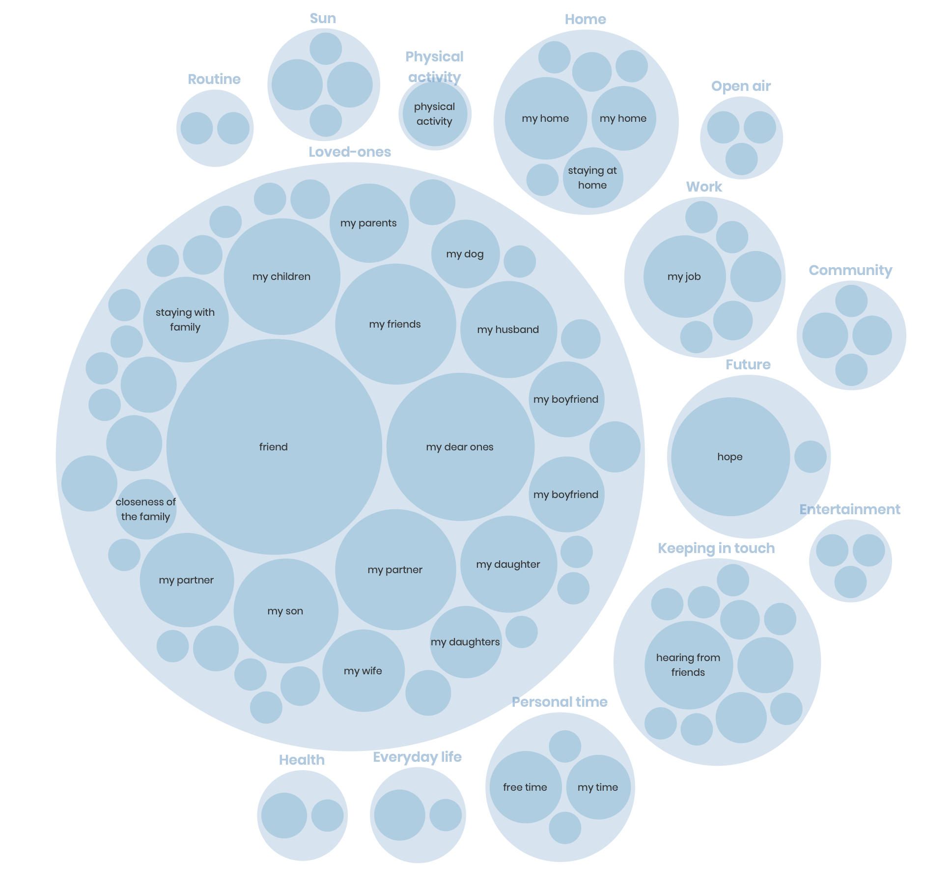 We analyzed answers to open-ended questions through NLP (Natural Language Processing) tools, in order to extrapolate the most relevant key concepts. For each open-ended question, we selected the 100 most relevant key concepts using the Keyphrase Digger (KD). tool. The key concepts have been grouped into topics, and they have been visualized according to their frequency. The areas of the circles represent the frequency of the selected topics and key concepts. These data visualizations are interactive.